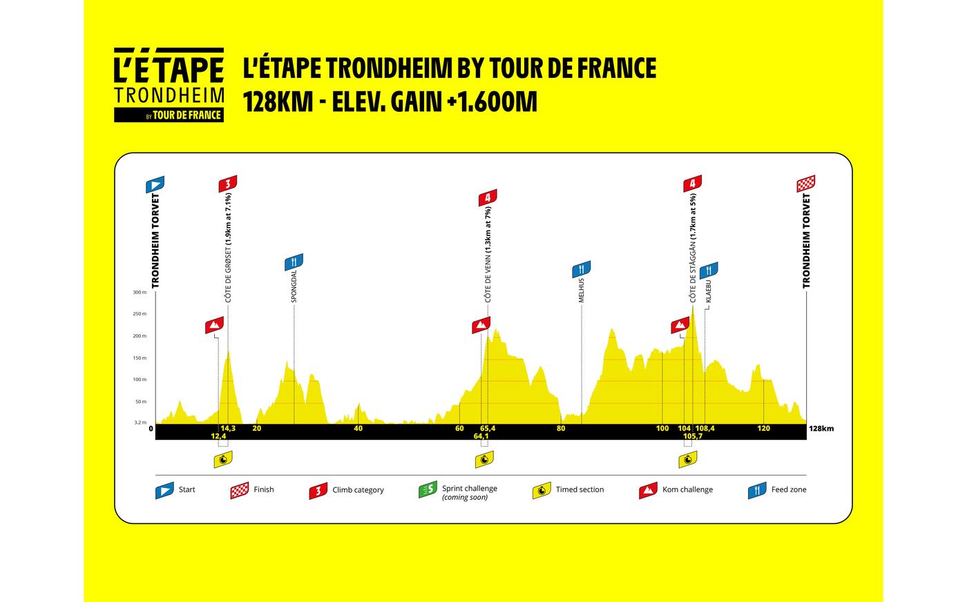Fra Klæbu går det nordover langs dalen og Nidelva, før du svinger inn mot Sluppen og gjennomfører de siste kilometerne tilbake mot Torvet og en ekte Tour de France-målgang med jubel, musikk og folkefest i Trondheim.